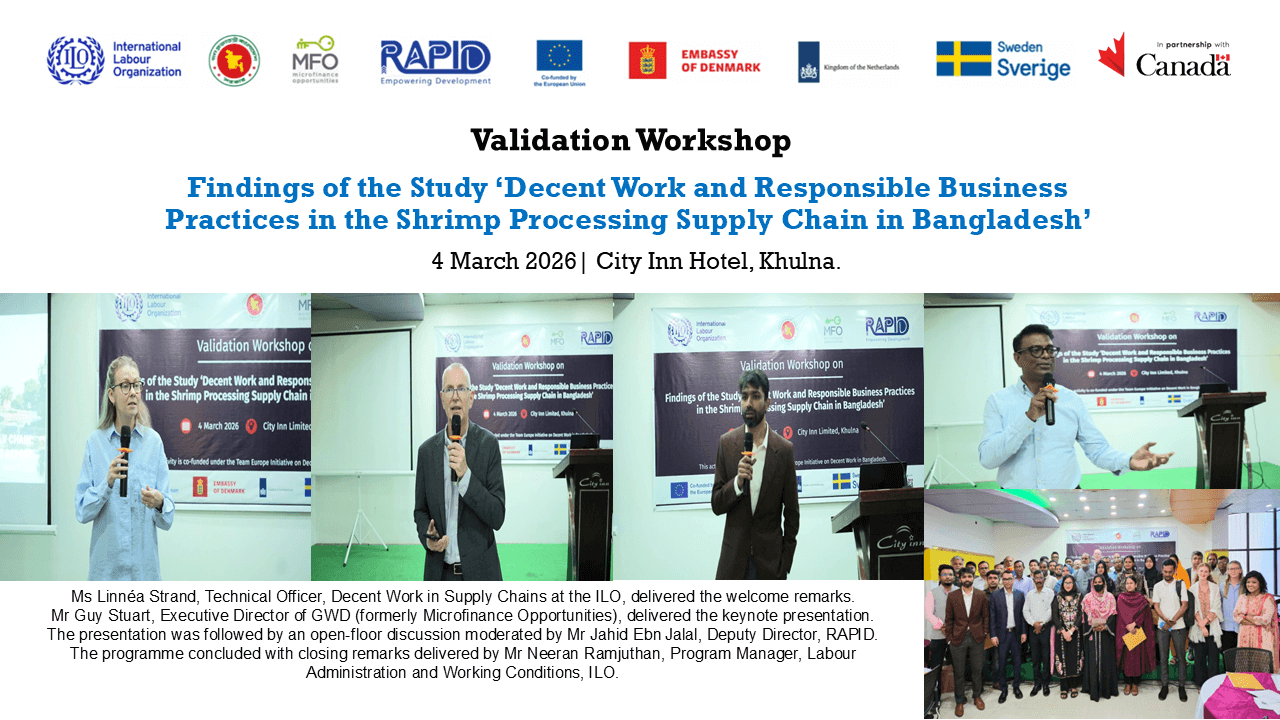 On 4 March 2026, a validation workshop on “Decent Work and Responsible Business Practices in the Shrimp Processing Supply Chain in Bangladesh” was organised in Khulna by International Labour Organization (ILO) and Microfinance Opportunities (MFO), in partnership with Research and Policy Integration for Development (RAPID). Ms Linnéa Strand, Technical Officer, Decent Work in Supply Chains at the ILO, delivered the welcome remarks. Mr Guy Stuart, Executive Director of GWD (formerly Microfinance Opportunities), delivered the keynote presentation. The presentation was followed by an open-floor discussion moderated by Mr Jahid Ebn Jalal, Deputy Director, RAPID. The programme concluded with closing remarks delivered by Mr Neeran Ramjuthan, Program Manager, Labour Administration and Working Conditions, ILO. The session brought together key stakeholders from the government, employer's and worker's associations, NGOs, development partners, and academia to reflect on the study findings and share valuable insights to strengthen responsible business practices within the shrimp processing sector. The initiative is implemented under the Advancing Decent Work in Bangladesh Project, supported by the Team Europe Initiative (European Union, Denmark, the Netherlands, and Sweden) and Canada.